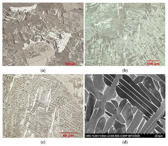 Ti-6Al-4VDPF optical micrographs after annealing and furnace cooled. Representation of the average grain size (a). Higher magnification showing the lamellar microstructure (b,c). Backscattered electron micrograph showing the alpha lamella morphology (d).