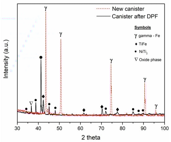 To evaluate the reaction at the canister–alloy interface, XRD analysis was performed on the stainless-steel canister’s inner surface before and after DPF (see Figure 7). The surface of the new canister presented a well-defined gamma phase spectrum, typical of austenitic stainless steel. On the other hand, after DPF, the canister’s inner surface showed a completely different diffraction pattern, having defined peaks for TiFe, NiTi2 and complex oxides. These phases have been formed by diffusion at the interface during the sintering and the thermomechanical steps. This observation was also reported by Scherillo et al., who obtained a similar XRD pattern on stainless steel canisters of HIPped titanium specimens [22]. Nevertheless, as seen in Figure 6, none of these phases were identified in the bulk of the Ti-6Al-4VDPF alloy.
