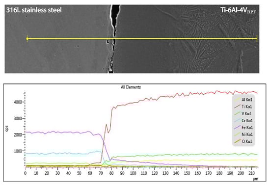 Further characterization was performed by SEM/EDS to evaluate the chemical variation between the Ti-6Al-4VDPF and the stainless steel canisters. Figure 8 presents an EDS linescan analysis that shows similar diffusion behavior for iron (Fe), chromium (Cr) and nickel (Ni) within the titanium alloy. We can also notice that the chemical composition returns to the nominal alloy’s values within 100 µm of the interface. This behavior is also mentioned by Scherillo et al. [22] and is expected when Ti-6Al-4V parts are HIPed with a stainless steel container. This result confirms that the surface contamination is limited with the DPF process.
