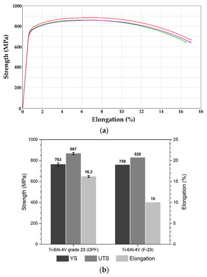 Mechanical properties of annealed Ti-6Al-4VDPF. Representative stress-strain curves are presented in (a) and the averages for YS, UTS and elongation compared to the standard requirement (grade F23) are presented in (b).