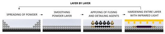 Hewlett-Packard introduced their own 3D printer working in a patented technology called Multi Jet Fusion (MJF) in 2014. The MJF printing process begins with applying a layer of powder on the top of build platform using a roller. The thickness of each layer is around 80 microns. Then, fusing and detailing agents are used and the whole layer is exposed to an infrared light. Fusing agent determines which places in the layer are bonded and detailing agent needs to endure sharp and smooth edges by limiting the bonding of powder near to the print surface. The following stages in MJF process are shown in Figure 1.