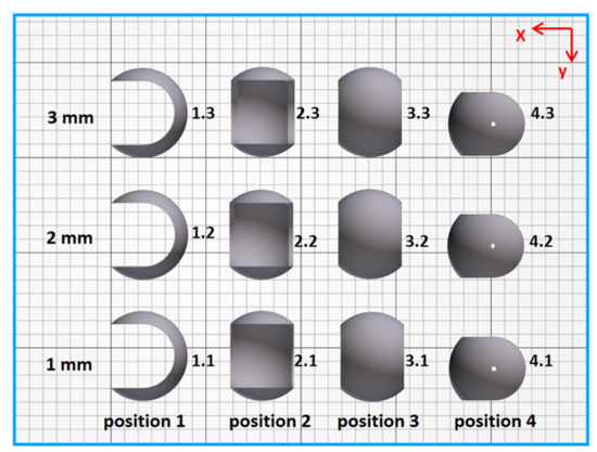 The orientation of analyzed parts in the printing chamber (top view); the samples are labeled X.Y, by position (X: 1–4) and thickness (Y: 1–3), respectively.