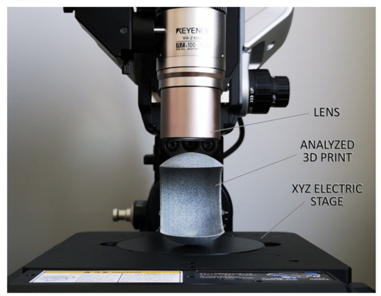 The as-designed and as-printed parts were then analyzed in detail in one specific region, i.e., near to the hole introduced into the element. Such fine details are often difficult to be properly produced or introduced locally to some non-desired surface and/or microstructural effects. The observations and measurements were made using a Keyence VHX-6000 digital microscope (Keyence, Osaka, Japan). The setting of the examined elements under the microscope was the same each time (Figure 4).