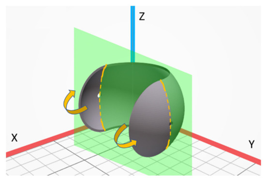 The model as well as the real part considered in this work are presented in Figure 2. Such spherical shape was chosen to emphasize differences in dimensional accuracy when changing the print thickness or its orientation in the printer chamber and to highlight the ability of MJF technology for producing such complex, highly curved objects. To study the influence of shell thickness on geometry, dimensional accuracy, and structure, three different versions of the initial model were prepared with 1 mm, 2 mm and 3 mm shell thickness. All other dimensions of the model were fixed, i.e., the external diameter of 60 mm and the diameter of the two holes equal to 3 mm. Furthermore, the influence of the build orientation is considered here and the four parts’ orientations in printing chamber are shown in Figure 3.