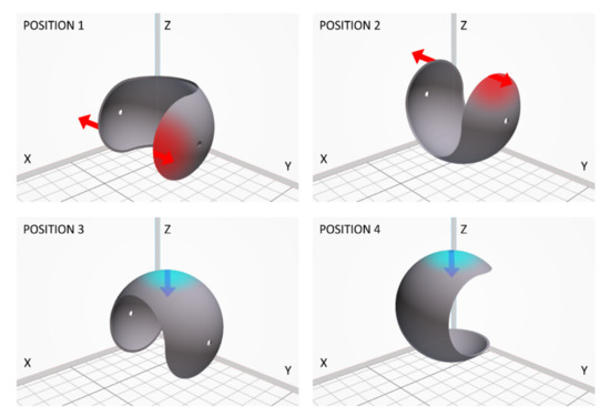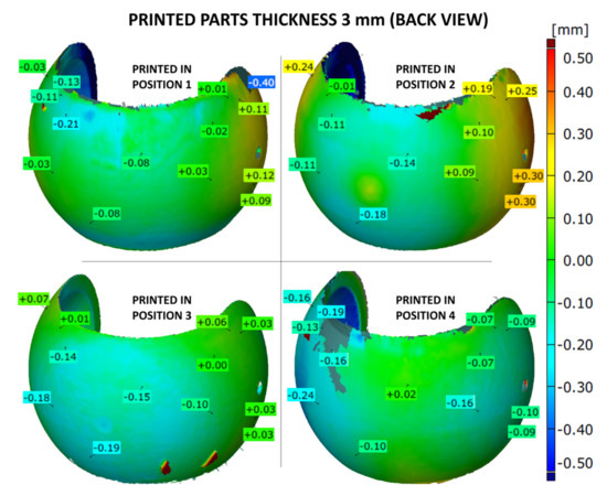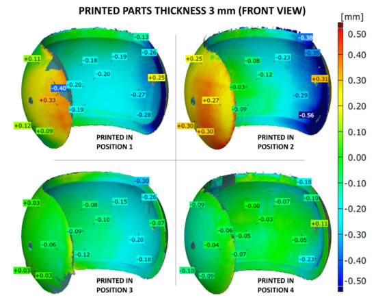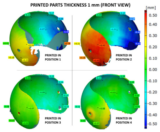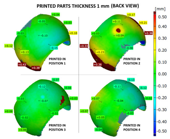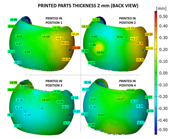 The shape accuracy of a 1 mm thick sample printed in four different positions in comparison with the original model is shown in Figure 7 and Figure 8. The most apparent shape deviations occurred in print orientation no. 1 and 2, near the model’s free edges. Position 2 seems to be strongly unfavorable for 1 mm thick model as it is characterized by high dimensional deviations, both positive and negative, reaching up to +0.45 mm and −0.47 mm. Furthermore, print orientation no. 2 is the only one where significant deviations were also observed at the back side of the print (Figure 8), which in discussed position was nearly parallel to the XY plane.
