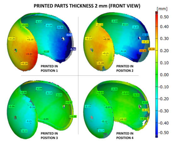 For 2 mm print thickness, the model-to-part deviation distributions were quite similar as in the case of 1 mm parts, for the respective building positions (Figure 9 and Figure 10). In case of print positions no. 1 and 2, the free edges of prints were characterized by positive deviations, suggesting a broadening of the print in that place. As it was revealed for thinnest parts, the 2 mm samples built in positions 3 and 4 have the lowest deviation rates. However, in these positions, some areas showed negative deviation. This was caused by the so-called capillarity effect, which affects large horizontal top surfaces. Finally, it seems that position 4 resulted again in overall highest shape accuracy, with very slight model-to-part differences.