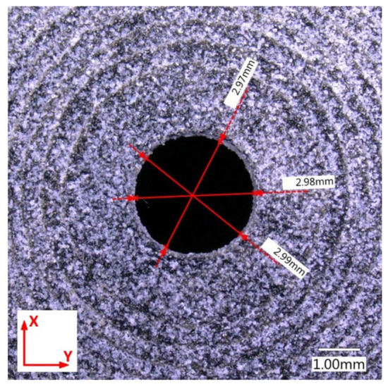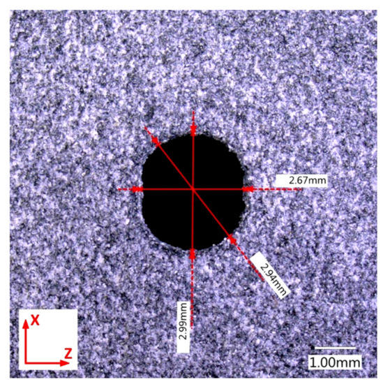 First, the diameter of holes was measured, which was set at 3 mm for all .stl models. The measurements showed that this value was consistent only for orientation 4 (Figure 14). For three remaining build directions, deviations from the circular to oval shape were clearly observed (see for example Figure 15, for orientation 1). The change, i.e., reduction, in diameter size (reduction) reached even 10% and this was similar for orientations 1–3. The described tendency was observed for all three analyzed print thicknesses. This is consistent with the recommendations of HP [40], suggesting to print holes along the X-Y plane in order to achieve highest resolution in such cases in MJF technology.