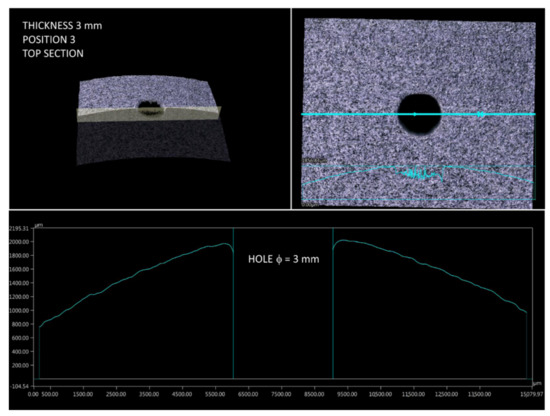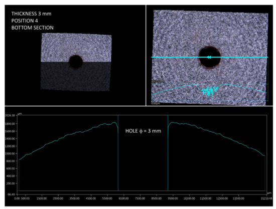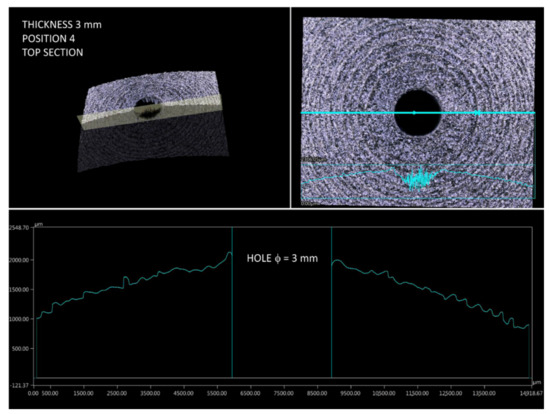 The dimensional deviations for thickest, 3 mm, prints are presented in Figure 11 and Figure 12. The 3D maps are very similar to the ones obtained for thinner samples. The overall values of dimensional deviations seem to be slightly lower than for 1 or 2 mm prints. The capillarity effect is still present but less evident as well. Furthermore, the part produced according to position 4 revealed again the lowest dimensional deviations in the analyzed batch of 3 mm thick samples.