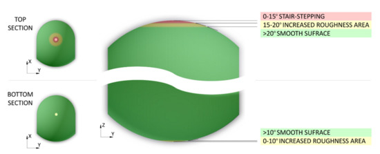 The issues with printing spherical surfaces are related mainly to the specific layer thickness in each technology. The thicker the layer is, the greater the surface topography issues, i.e., well-known stair stepping effect. Moreover, the generation of .stl file for printing process can also be important. As this is a geometrical representation of the 3D model using triangular elements [36], an accurate mesh increases the dimensional accuracy of the prints itself. Otherwise, it causes the heterogeneous triangular structure of printed elements and significantly reduces the quality of the prints. However, the use of fine element size has an opposite effect on the processing and printing speed, so a compromise is necessary here.