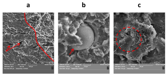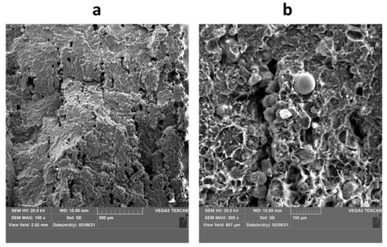 All fracture surfaces revealed intralayer porosity, voids and non-processed powders. They were all observed usually in low volume, which is also clarified later. So-called intralayer porosity is a structural defect that may be created in powder bed fusion processing mainly during the sintering stage of the powder particles as a result of poor fusing of powder particles, which produce later empty spaces in the print structure. Therefore, the intralayer pores may be of slightly different morphology and size, i.e., irregular or spherical with a size similar to one or several powder particles, but usually they are of ovoid shape (see Figure 20a, labeled with arrows). Such porosity is observed in different powder-based manufacturing processes [44], including additive manufacturing [45,46] and Multi Jet Fusion as well [47]. The selection of proper process parameters and reduction of print porosity is important for building parts with proper functional properties.