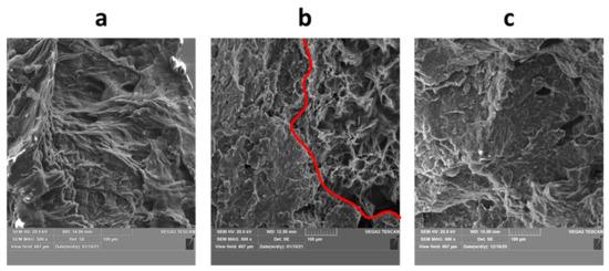 Some specific phenomena, valid only for some specific samples, depending on their thickness or build orientation, were also observed and discussed below. All studied surfaces contain ductile and brittle fracture regions (Figure 21a–c), similarly as observed in [48]. However, the ratio of ductile to brittle area was found to be dependent mainly on the print thickness. The lower the wall thickness, the more intensive ductile deformation in the fracture surface was observed (Figure 21a), and the greater area was covered by the ductile fracture. Then, by increasing the wall thickness, the mixed, ductile, and brittle mode of fracture was observed (Figure 21b), while for the thickest prints the fracture was mainly brittle (Figure 21c). The mixed fracture mode was also observed by Rosso et al. [48] but instead was linked to specific regions in the print, i.e., more ductile in the upper part of fracture surface and more brittle in the lower parts. Furthermore, other powder bed fusion processes, like SLS, show rather more brittle behavior [49], which may suggest that MJF provides prints with higher toughness and capable to absorb more energy before final failure.