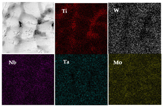 The alloying elements of surfacing formed layers looked uniformly distributed without obvious component segregation. However, the micro-scaled area-scanning results of distributed elements displayed concentrated W and Ta elements in the dendrites (Figure 4). By comparison, the Ti element was mostly distributed at the intergranular, and both Nb and Mo were evenly distributed in both regions. Moreover, this means that certain dendrite segregation existed. Table 1 provides each element’s segregation rate (SR), defined as the ratio of elements in intragranular to intergranular phases. Note that more deviation between SR and 1 led to more serious dendrite segregation.