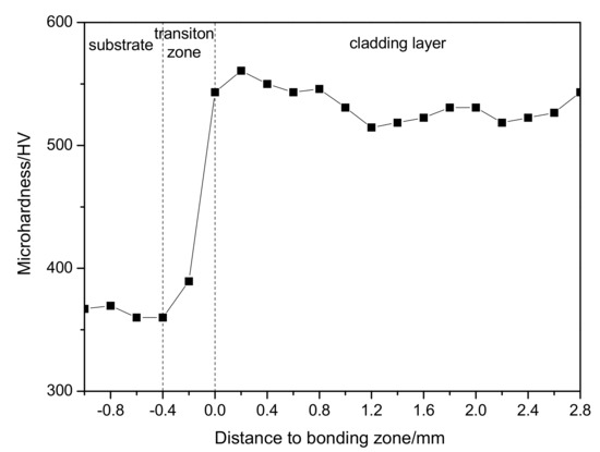 The distribution curve of Vickers hardness of the formed MoNbTaWTi alloy layer is displayed in Figure 5. The overall hardness of the surfacing formed layer averaged 533 HV0.2.