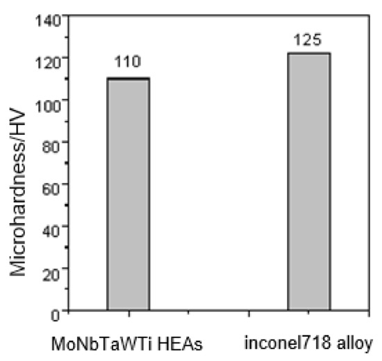 Figure 6 compares the hardness of overlaying layer of MoNbTaWTi refractory HEA with that of Inconel 718 nickel-base superalloy at 1000 °C. The average hardness of the overlaying layer at 1000 °C was estimated to be about 110 HV1, which was close to the 125 HV1 of Inconel 718 alloy.