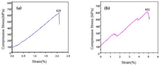 Compressive stress-strain curves of MoNbTaWTi Arc Surfacing layer at the high temperatures: (a) T = 500 °C and (b) T = 1000 °C.