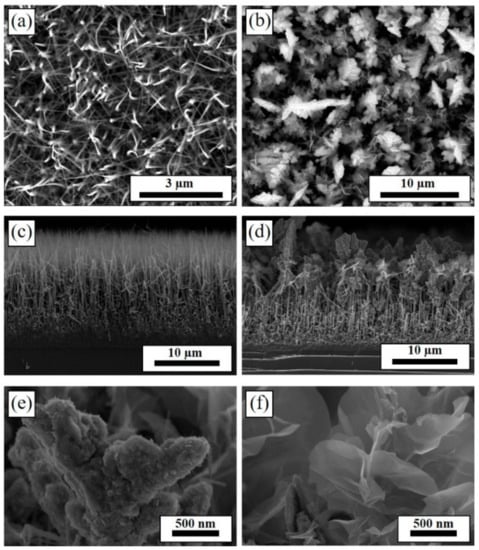 The top-view SEM images of the SiC NW film (a) before and (b) after Co3O4 decoration; their corresponding cross-section SEM images are shown in (c,d), respectively. (e,f) Are the high-magnification cross-section SEM images of the top side of (d).
