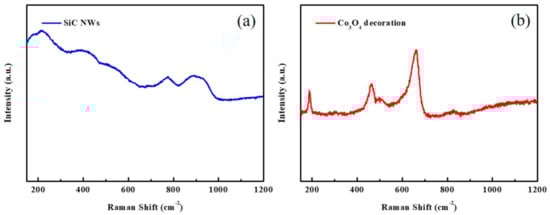 Raman spectra of (a) SiC NW film, and (b) Co3O4/SiC NTA film.