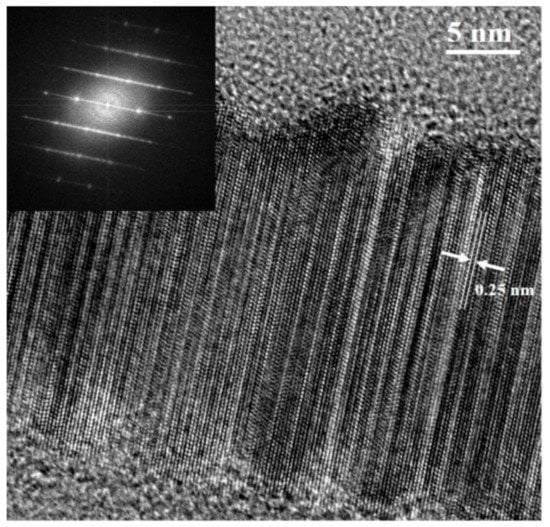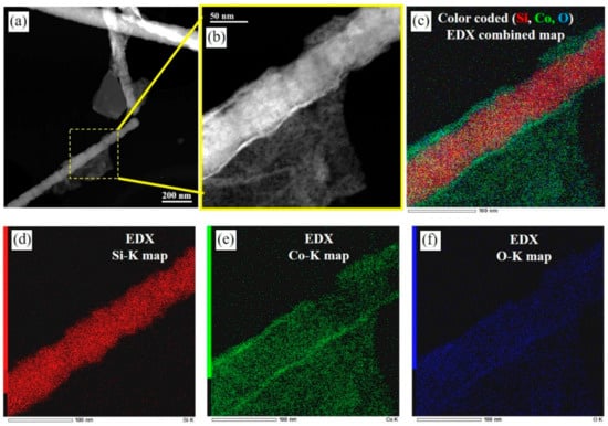 The HRTEM and EDS are further utilized to characterize the samples, as shown in Figure 3 and Figure 4. Figure 3 shows the lattice fringe of a SiC NW, where a lattice spacing of about 0.25 nm can be assigned to the <111> lattice plane of SiC (i.e., along the c-axis of hexagonal polytypes or the <111> direction of the cubic polytype) [22,28]. As shown in the inset of Figure 3a, the typical streaking of reflections in this Fourier transform image confirm the presence of stacking faults along the NW axis; a high density of stacking faults associated with the presence of poly-types of SiC (i.e., mainly 3C-, 4H- and 6H-SiC). Figure 4a shows the TEM image of the Co3O4-decorated SiC NWs with Co3O4 sheets, and the enlarged image of the region in yellow dash frame is shown in Figure 4b. As shown in Figure 4b, the Co3O4 coating on the side-wall of SiC NW is conformal and continuous, and the thickness of the Co3O4 coating layer is around 7~18 nm. Moreover, the conformal and continuous characters of the Co3O4 coating is further verified by the elemental distribution maps (Figure 4c–f) for a representation of the image shown in Figure 4b. Both Co and O characteristics of the Co3O4 are well distributed over the surface of SiC NW, revealing that the electrodeposition is effective for material loading onto high aspect-ratio nanostructures. We expect that the coating of Co3O4 layer on the surface of SiC NWs could distribute the charge flux evenly along the one-dimensional nanostructure of the SiC NWs, and the effective utilization of the high surface area of the SiC NWs would lead to less charge accumulation; both would facilitate the charge transfer kinetics in the electrochemical reaction.