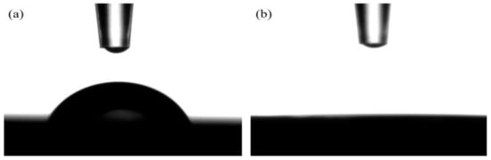 Surface contact angles of water droplets on the SiC NW film (a) before and (b) after Co3O4 decoration.