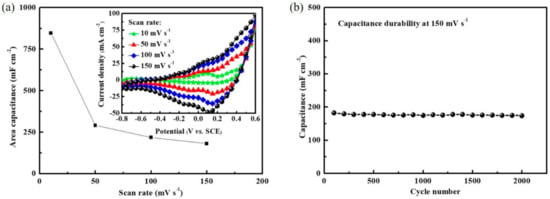 Figure 6a shows the variation of areal capacitance for different scan rates by using a Co3O4/SiC NTA electrode. All the areal capacitance values are extracted from the cyclic voltammetry curves, as shown in the inset of Figure 6a. As the scan rate increased, the current density increased; all cyclic voltammetry curves remain of similar shape even at high scan rates, suggesting that the inner area underneath the Co3O4/SiC NTA was able to contribute to the capacitance because of the hierarchical structure (i.e., the Co3O4 nano-flower-clusters and continuous/conformal Co3O4 coating on SiC NW arrays) developed inside the Co3O4/SiC NTA electrode. The areal capacitance values were calculated to be 845, 291, 218, and 182 mF cm−2 at scan rates of 10, 50, 100, and 150 mV s−1, respectively. To evaluate the durability of the Co3O4/SiC NTA electrode, the cycling performance was tested under a high scan rate of 150 mV s−1, and the obtained capacitance values in each cycle were plotted as a function of the cycle number (Figure 6b). Herein, we observed a negligible change on the capacitance of the Co3O4/SiC NTA electrode after 2000 cycles.