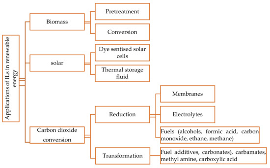 The performance of ILs can be credited to their ability to improve solubility, activation, and electrochemical conversion of CO2 under moderate reaction conditions to fuels. This makes ILs appealing as an alternative media. Furthermore, typical electrolytes used for CO2 conversion have drawbacks such as high volatility, separation behaviour, corrosivity to metals, and instability in electroreduction or transformation, which motivated the scientific community to focus on ILs [7,10,11,12,13,14]. There have recently been numerous studies on the utilisation of CO2-saturated ILs as electrolytes to enhance the electroreduction of CO2 and electrosynthesis of organic chemicals (such as carbonates, carbamates, etc). Recently, ILs have been explored as thermal energy storage fluids, and are becoming a promising research topic [11]. Because of their high ionic conductivities and wide electrochemical windows, as well as their increased solubility relative to traditional solvents, ILs can play a critical role in CO2 conversion. Figure 1 depicts the use of ILs in renewable energy applications.