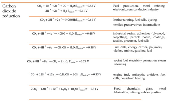 Summary of the possible CO2 reductions with their redox potentials and applications.