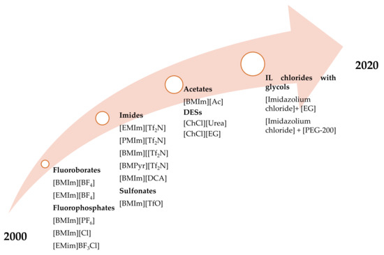 Most of the works covered in this review focused on the combinations of imidazolium, pyrrolidinium cations with different anions: [BF4]−, [PF6]−, [TfO]−, [Tf2N]−, [FAP]− with concentrations from pure ILs to millimolar, molar ranges but the optimum compositions were not determined. As these systems pose certain safety hazards such as carcinogenicity, toxicity, bio-degradability, they might have to be replaced with less hazardous category of ILs in order to comply with the safety regulations such as REACH, Restriction of Hazardous Substances (RoHS). Development of halide-free ILs, DESs alternative to imidazolium chlorides (such as acetates), less hazardous alkylating agents (eg.CH3OK) can be considered as a way forward.