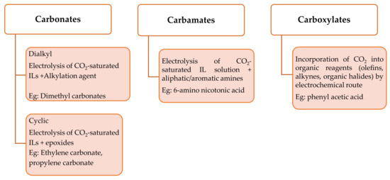 An another effective method of utilising CO2 is to electrosynthesize the C1 feedstock into valuable fuel additives without the use of a hydrogen source [9,49]. In general, this non-hydrogenation process with mild working conditions converts CO2 into a diverse array of organic compounds such as carbonates (cyclic, dialkyl), carboxylic acids, and carbamates. Carbonates, specifically cyclic and dialkyl ones were identified to be the most effective fuel additives. It is possible to electrosynthesise numerous kinds of products via the transformation pathway through electrochemical processes involving CO2. A wide variety of substrates such as epoxides, alcohols, amines, aryl halides, and olefins have been used to transform the CO2 into their respective organic compounds [9,50,51,52]. This approach is thought to be the most efficient for some reactions that are thermodynamically unfavourable in the absence of external energy and when thermal catalysis options are severely constrained. The use of an electrochemical approach to synthesise organic compounds has several merits, including moderate conditions, high functional group tolerance, and inherent scalability and sustainability [8]. The general pathway of electrosynthesis of products (such as carbonates, carbamates, and carboxylates) via CO2 transformation involves the generation of electro-induced radical/anion from CO2-saturated with ILs and/or substrates. Subsequently, the generated radical/anion reacts with other substrates, yielding either of the transformed products mentioned above. Several investigations on the studies performed in this field have further shown that ILs have a stabilization effect on the electro-induced CO2 molecule or substrates (epoxides, ketones, alkenes, etc) radical/anion. When combined with the high reactant CO2 solubility and favourable electrochemical properties required for CO2 transformation, ILs are viewed as an alternative eco-friendly and prospective reaction medium to the currently utilized hazardous volatile organic solvents [51]. Previous review papers [8,9,50,52,53] address the significant research published in this domain, with a focus on the electrosynthesis of carbonates via the transformation route. As a result, this section presents a succinct overview of the most recent developments in the value-added chemical compounds generated by electrosynthesis via the CO2 transformation route in ILs other than carbonates. Figure 4 depicts the product classes that are generally produced from electrosynthesis via the transformation pathway utilising CO2-saturated with ILs.