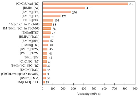 A large array of ILs in the range of ~1018 were discovered through different arrangements of cations and anions, which can possibly be synthetized and present a good platform for design [68,69,70], but, it is interesting to note that only ~102–103 ILs were commercialised. This could be ascribed to the complexities in the methods of preparation, expensive equipment, controlled operating conditions, availability of raw materials, costs, storage and safe handling after the synthesis, and limited availability of the physical, chemical property data base [71,72,73,74,75,76]. Most of the properties available so far are derived using the machine learning methods [77]. In addition, studies and data concerning the environmental considerations, recycling, biodegradability, recovery and reuse, thermal stability is very limited and lacks significant consideration [78]. Also, the high viscosities of traditional ILs limit their direct application for the electrosynthesis of organic molecules from CO2, electroreduction of CO2 to CO and other chemicals, which is the main reason why binary IL systems have received a lot of significant interest recently. The higher viscosity of ILs pose the difficulties in transportation of the reactant species (CO2) despite their high solubility. As a result, from the standpoint of functioning in a real-world application, a simple and efficient system is still required. In the recent times, DESs prepared by mixing imidazolium chloride ILs with hydrogen bond donors such as [ChCl:Urea], [ChCl:EG], 1M [ChCl] in EG, and [BMIm][Cl]:EG and, were shown to exhibit substantially lower viscosities than expected when compared to unmodified ILs [17,45]. Figure 5 compares the viscosities of the ILs and DES systems employed for either electroreduction or electro-organic transformation utilising CO2.