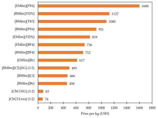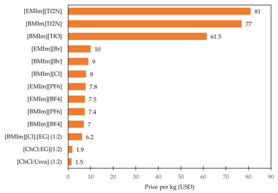 Figure 6 depicts the plots based on commercially accessible pricing, and Figure 7 is plotted based on the cost of the raw materials utilized in the synthesis of these ILs, DESs and the methodology adopted by Cui et al. [15] in their review. The cost for DESs is evaluated based on their mole ratios of the individual components and the commercially available pricing. Since the price variations per kg of the product are quite significant, the associated costs with ILs, DESs synthesized from raw materials are presented individually. Data from Figure 6 and Figure 7 signify that the cost of ILs paired with [TfO]− or [Tf2N]− anion is higher than that of other ILs. These cost comparison data derived from the Figure 6 and Figure 7 validates the fact that the cost of imidazolium-based ILs is mostly determined by the anions, in line with the above analysis. It is worth noting that the price of DESs from Figure 6 and Figure 7 are significantly lower than ILs, which further validates the scientific claims. Also, it might be the primary reason to motivate the industries to focus on their development.