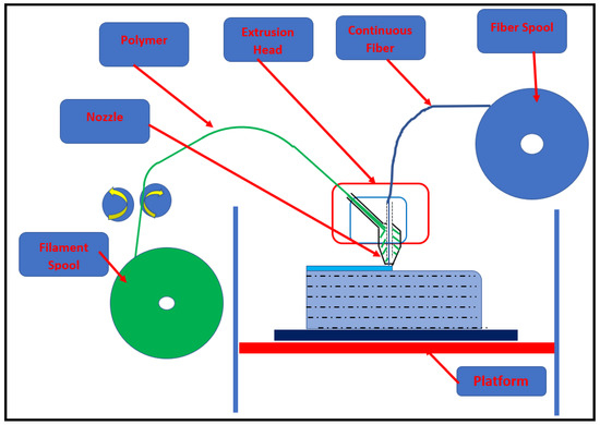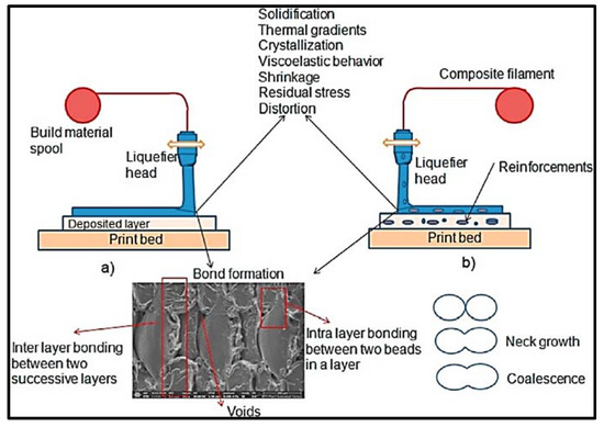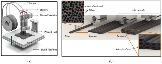 (a) Schematic illustration of conventional FDM Processes; (b) structural illustration of the FRP-printed part [54] (reprinted with kind permission from Elsevier).