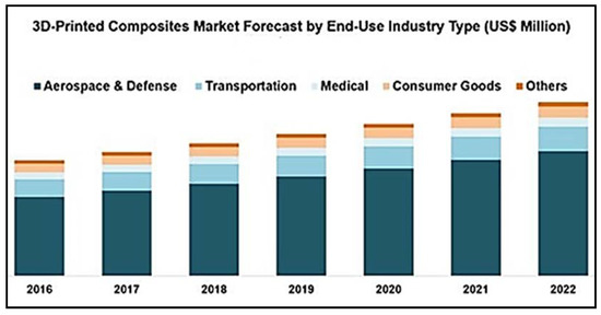 FRP provides the desired strength and stiffness while being light weight at the same time. This lightweight property is controlled by using the weight of the matrix in the fiber-matrix material system. In addition to these properties, FRPs are capable of operating at higher temperatures, chemical inertness, and have the ability to provide better damping [15]. Due to the fact of these qualities, FRP composites are rapidly replacing conventional ferrous and non-ferrous metals and their alloys. It can also be observed that the global market growth for FRP composites is increasing rapid. As reflected in Figure 2, the US composite market (FRP) is forecasted to have a compound annual growth rate of 11.3% from 2017 to 2025 [16]. At the same time, industry is adopting 3D-printing technologies to print FRP composites. As shown in Figure 3, the 3D-printed composites market is forecasted to grow to 111 million USD between 2017 and 2022 [17].