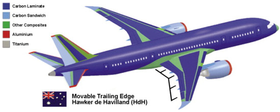 FRP composites are widely used in the construction of passenger aircrafts. The Airbus A300 utilized CFRPs for spoilers, rudders, and airbrakes. Different famous FRP composites, such as CFRP, GFRP, and AFRP, were utilized in the Airbus A330/340 [15]. It is estimated that approximately 50% (by weight) of modern aircrafts are made of composites as shown below in the Boeing 787 Dream Liner in Figure 5. The Boeing 787 was the first air jetliner that utilized composite materials as leading structural materials in the airframe structure. The Boeing 787 carries 23 tons of composite materials. FRP composites are used in key body aircraft parts such as fuselage, upper and lower wing skins, radom, wing flaps, elevators, vertical fins, and horizontal stabilizer. Carbon-fiber epoxy is laid up with the help of robotic heads and fibers are reinforced in the desired directions to support maximum loads [21].