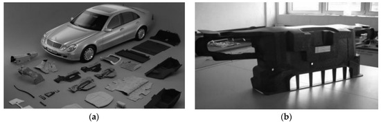 Natural composites applied in the automotive sector (a) Components of Mercedes-Benz E-Class (b) Ford Montagetrager front-end grill (available under a Creative Commons license [26]).