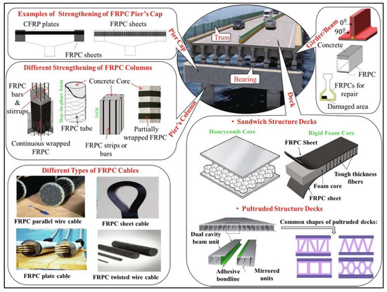 - Ali, H.T.; Akrami, R.; Fotouhi, S.; Bodaghi, M.; Saeedifar, M.; Yusuf, M.; Fotouhi, M. Fiber reinforced polymer composites in bridge industry. Structures 2021, 30, 774–785. [Google Scholar] [CrossRef]