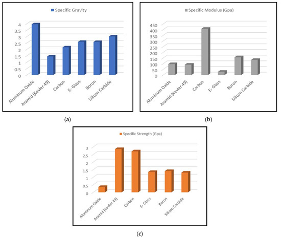 Comparison of different commonly used fiber materials: (a) specific gravity; (b) specific modulus (GPa); (c) specific strength (GPa) (based on data from [35]).