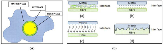 In order to bond matrix and fiber together, a bonding agent is utilized at the interface of both as shown in the Figure 10A [36]. To perform adequately, a composite material should be bonded properly at the interface region [37]. The interface has an important role, as it transfers a load from the matrix to the reinforcements. Better bonding at the interface results in higher stiffness and strength of the resulting composite [38].