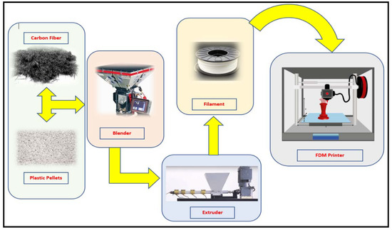 In the first method, a filament is a mixture of short fibers and polymer and printing happens using the conventional FDM-based printing process. Figure 13 shows the schematic illustration of the material flow in the FDM printing of the FRPs. The figure shows that CF and plastic pellets are blended together in the blender and extruded in the form of filament. The prepared CF-polymer filament is then utilized in the conventional FDM printer for printing purpose.