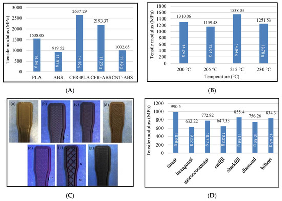 (A) Modulus of five different 3D printed materials. (B) Modulus of PLA at different nozzle temperatures. (C) PLA sample with infill patterns: (a) linear, (b) hexagonal, (c) moroccanstar, (d) catfill, (e) sharkfill, (f) diamond, and (g) Hilbert. (D) Modulus of PLA@50% infill density under different infill patterns (available under Creative Commons license [63]).