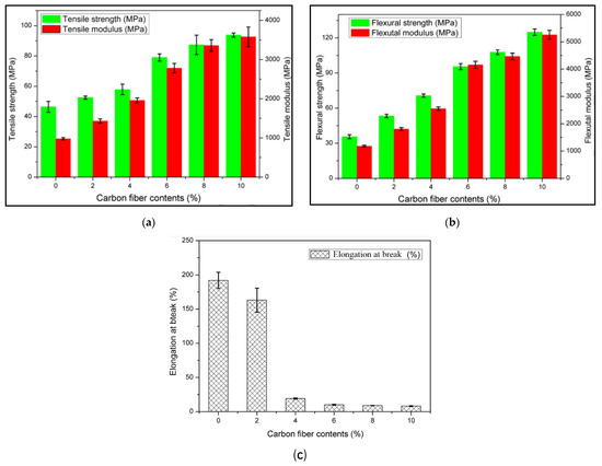 Effect of increasing fiber content % wt: (a) tensile modulus and strength; (b) flexural modulus and strength; (c) elongation at break (%) [66] (reprinted with kind permission from Elsevier).