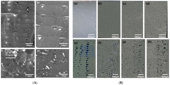 (A) Fractography of (a,b) conventional FDM-ABS (c) FDM printed with 10% wt. carbon fiber and (d) 10% wt. carbon fiber compression molded [60]. (B) Short fiber-based composites by compression molding (a–d), FDM-printed short fiber composites (e–h) with the fiber volume fraction changing from unfilled to 30 wt.% with a 10% increment [60] (reprinted with kind permission from Elsevier).