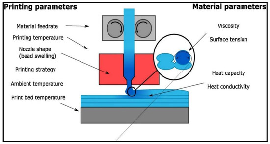 The functionality of 3D printed FRP composites is strongly associated with the sintering of polymeric materials. Sintering in 3D printing is controlled through temperature and surface contact. Temperature is important because it governs the flow properties by influencing the surface tension and viscosity of the molten polymeric material. Heat distribution in the printed layers is controlled by the thermal conductivity and heat capacity [79,80]. The whole process becomes more complex due to the involvement of fiber content and dependency of material parameters with respect to the printing parameters. Figure 21 shows the influencing parameters to get optimal level of sintering between different polymeric layers.