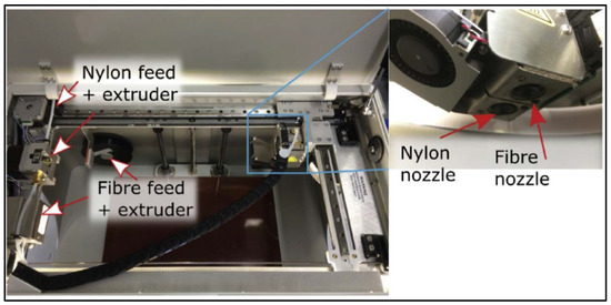 In the second approach, fiber is in a continuous form and mixed with polymeric matrix to print functional parts. The literature [55,56,57] reveals that there are three different options to incorporate continuous fiber in the matrix. These methods are differentiated in terms of timing and location of fiber-matrix mixing. In the first simple approach, prefabricated composite filaments are utilized to print the part using conventionally available FDM printers. It is referred to as a simple approach because it requires little change from the conventional FDM setup. In the second approach, the fiber and matrix are separated prior to reaching the print head, and they mix in the printing head that makes the mixing flexible. However, it comes with a challenging printing head setup. Air inclusion should be avoided by precise control during the fiber infiltration process [55]. Figure 14 represents the second type of printing arrangement. In the third case, fiber is deposited directly onto the polymeric component using separate mechanisms. Fiber impregnation is critical in this case, and inappropriate fiber deposition causes defects in the 3D-printed FRP composites. However, temperature-controlled post-processing can increase the strength significantly [58]. Table 2 shows different types of FDM-based FRP printing methods.