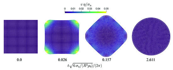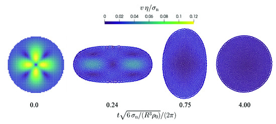 Oscillation of a free droplet with a divergence-free initial velocity field. The normalized velocity magnitude is color-coded. The time is normalized by the oscillation frequency (Equation (52)).