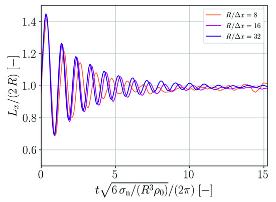 Normalized lateral expansion of the oscillating droplet as a function of normalized time for different spatial resolutions.