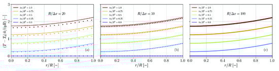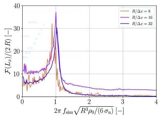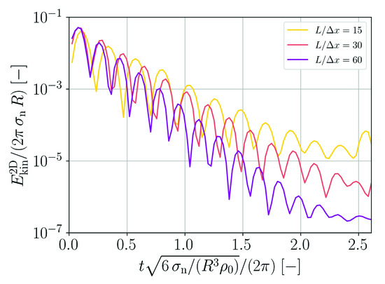 In order to obtain the normalization factors in Equation (19) and in Equation (20) the gradient magnitudes and are summed over a column of particles i perpendicular to the surface similar to the in [23]. The inverse sums yield the normalization factors shown in Figure A3 for four different kinds of SPH kernel functions. For the case of the field, the normalization factor increases with the ratio and appears to reach a plateau for large ratios. For the case of the unity field, the normalization factor oscillates around 2 for ratios and is close to 2 for larger ratios.