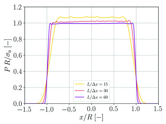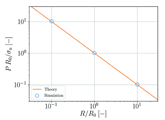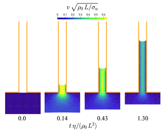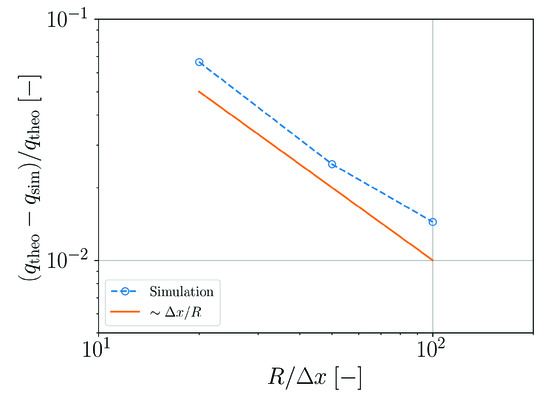 Unless otherwise stated we are using an ethylene glycol parametrization for the present SPH simulations, i.e., a rest density , a viscosity and a surface tension . Ethylene glycol is chosen here as an example for a real fluid which is used in many technical applications. If gravity is used, then with . Furthermore, the speed of sound is set to unless stated otherwise and the isentropic exponent of the equation of state is . We typically use a ratio of smoothing length and initial particle spacing of and accordingly for and for (compare Appendix A). In Section 3.5 and Section 3.6 the viscosity model according to Equation (30) is used. For all other fluidic benchmarks, the viscosity formulation according to Equation (29) is used. For the benchmark cases in Section 3.5, Section 3.6, Section 3.12 and Section 3.13 artifical viscosity with parameters and is used. For all other cases artificial viscosity is not activated.