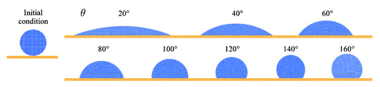 - Yeganehdoust, F.; Yaghoubi, M.; Emdad, H.; Ordoubadi, M. Numerical study of multiphase droplet dynamics and contact angles by smoothed particle hydrodynamics. Appl. Math. Model. 2016, 40, 8493–8512. [Google Scholar] [CrossRef]