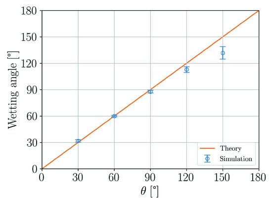 Similarly to Equation (37) the wall contact angle is mapped onto the fluid particles,