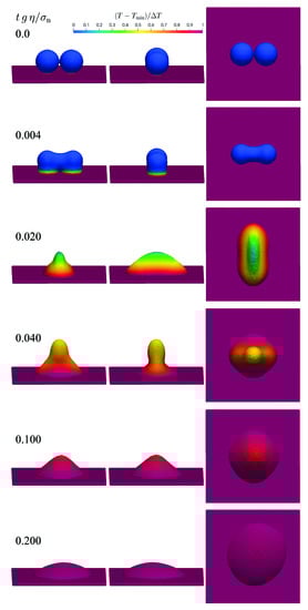 The initial radius of the droplet is and the resolution is varied between and which corresponds to 8 and 32 particles per radius. Snapshots from the simulation with the finest resolution are shown in Figure 1.